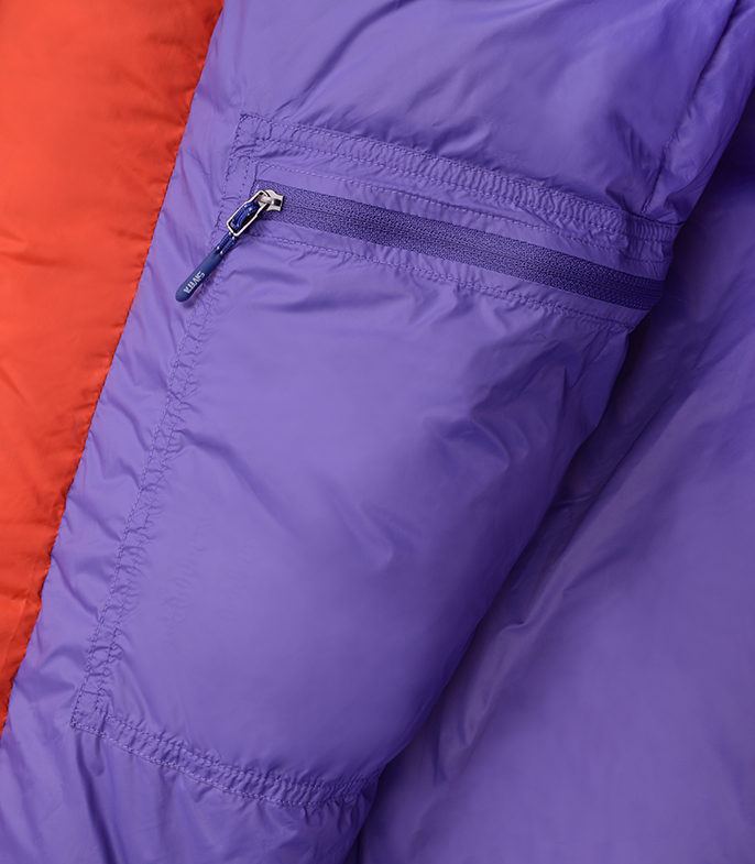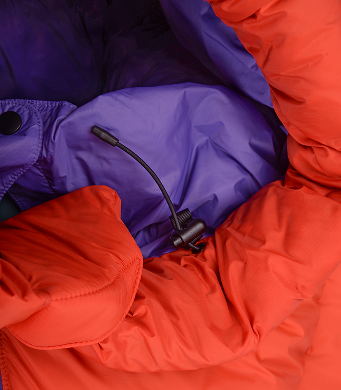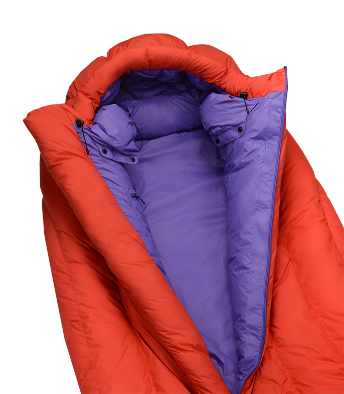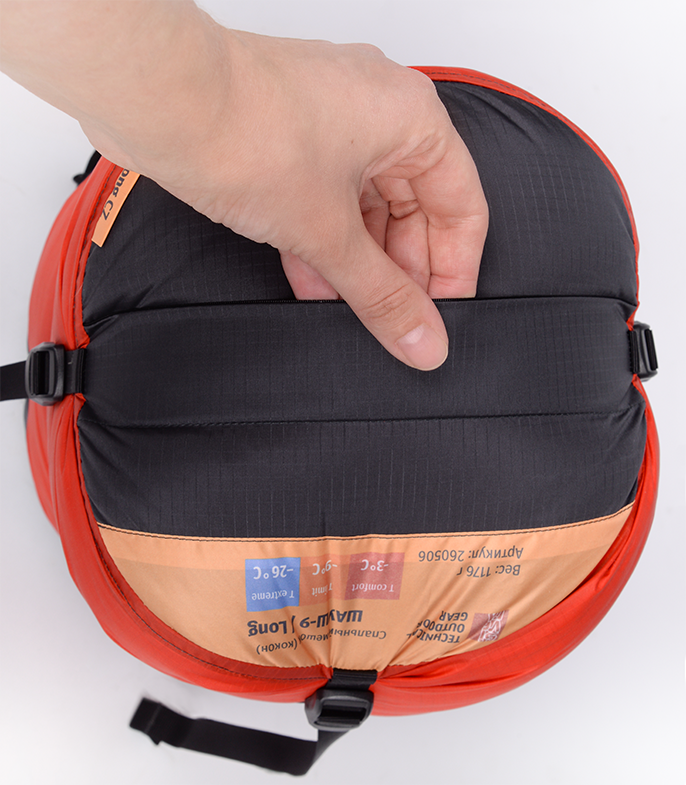 Продольные отсеки утепленные пухом с тёплыми швами на верхней и боковых частях спального мешка, нижняя часть утеплена SmartLoft. Анатомическая форма мешка в области ступней.