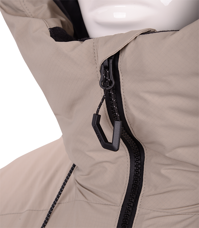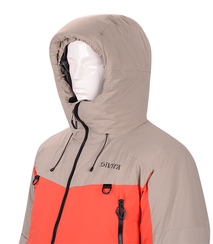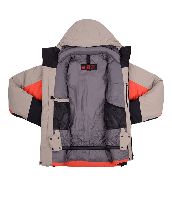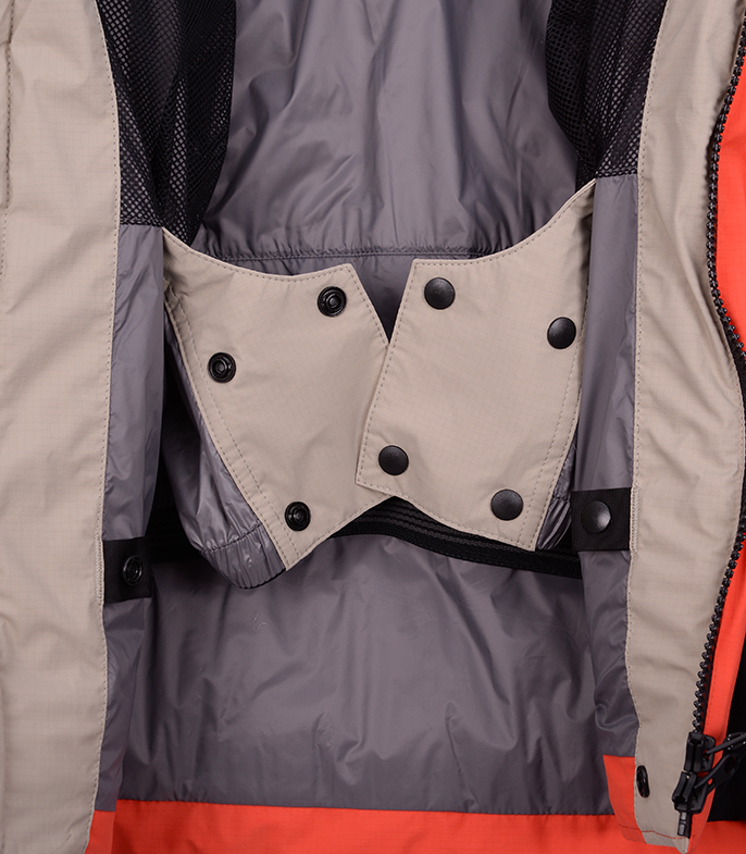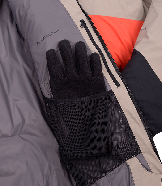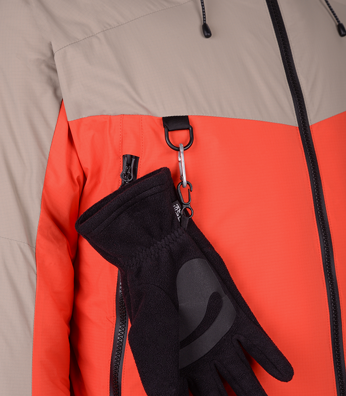 Прочная мембраннаая ткань из нейлона с рипстопом в совокупности с влагозащитной и морозостойкой фурнитурой YKK, а также рядом функциональных элементов позволяют обеспечить надежную защиту от ветра и снега и уменьшить конвективные потери тепла. Приподнятые карманы с единым удлиненным входом позволяют разместить как мелочи, так и объемные вещи. Также входы могут использоваться для дополнительной терморегуляции.