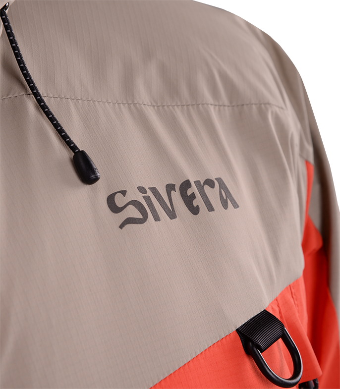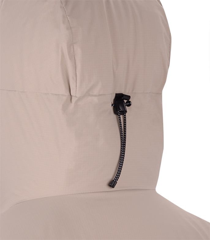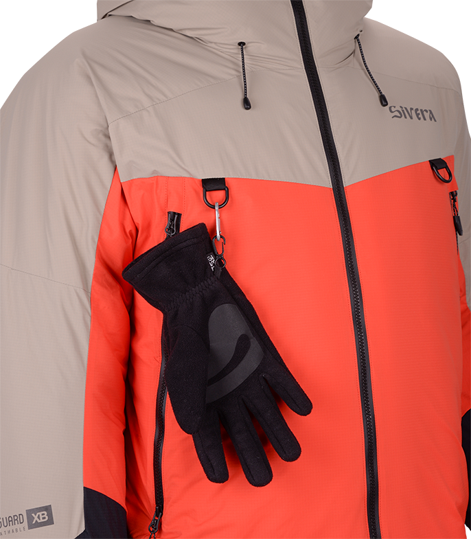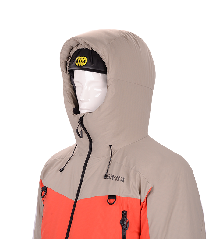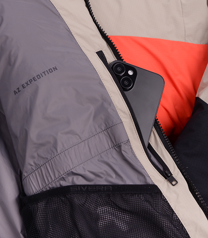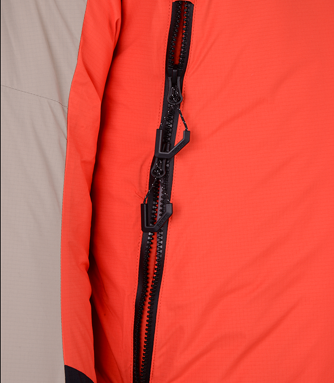 Прочная мембраннаая ткань из нейлона с рипстопом в совокупности с влагозащитной и морозостойкой фурнитурой YKK, а также рядом функциональных элементов позволяют обеспечить надежную защиту от ветра и снега и уменьшить конвективные потери тепла. Приподнятые карманы с единым удлиненным входом позволяют разместить как мелочи, так и объемные вещи. Также входы могут использоваться для дополнительной терморегуляции.